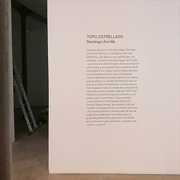 Después de quince años de trabajo, Domingo Zorrilla ha dado por concluida su obra más ambiciosa: una tabla no muy grande que, sin embargo, contiene toda una imagen del mundo. La comenzó en 2008 al saber de la existencia de este animal, y en seguida tomó conciencia de la envergadura del trabajo que se había propuesto, que implicaba renunciar a las coordenadas vitales habituales para profundizar en un tiempo casi geológico, un cambio de dimensión para el que ya se había entrenado con su obra anterior. Ha trabajado en ella al compás de la creación de otras obras, hasta acabarla este año 2023. Para celebrarlo, se presenta aquí por primera vez al público, por fin terminado, Topo estrellado.
