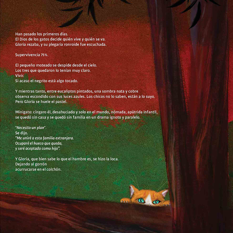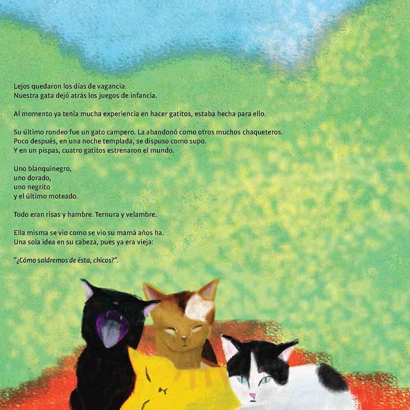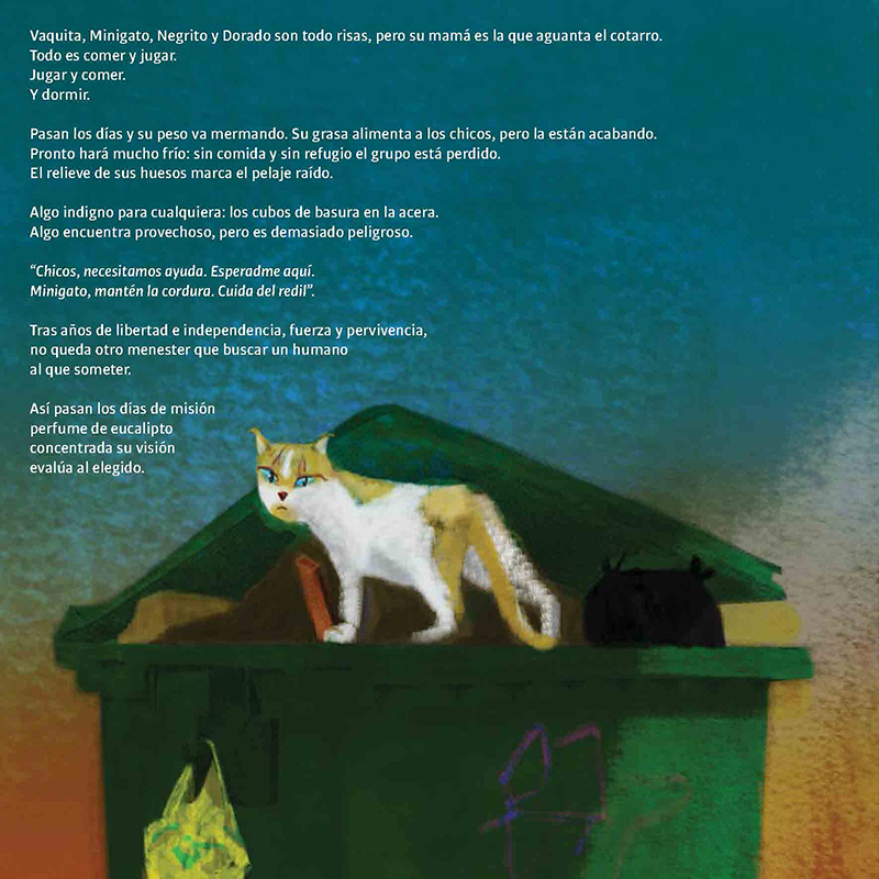 Me rompe la cabeza no saber el pasado de este adorable animal, por eso me inventé su historia y ya. Con un texto ilustrado y una narrativa más o menos versada, es un relato tope dramático, donde se mezcla la vida y la muerte en las relaciones entre animales y, de refilón, entre humanos. Un ciclo de creación y destrucción desde un punto de vista natural y felino. Parte de su historia está documentada en una miniserie de cuatro episodios.